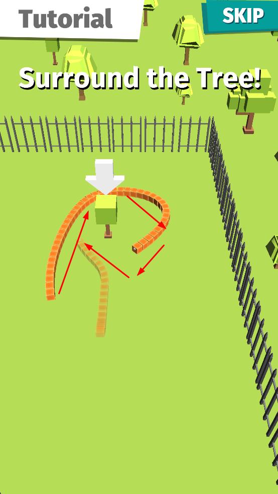 1、進(jìn)入教程界面,按指引圍繞樹木搭建彎曲路徑,完成包圍操作,開啟游戲流程。