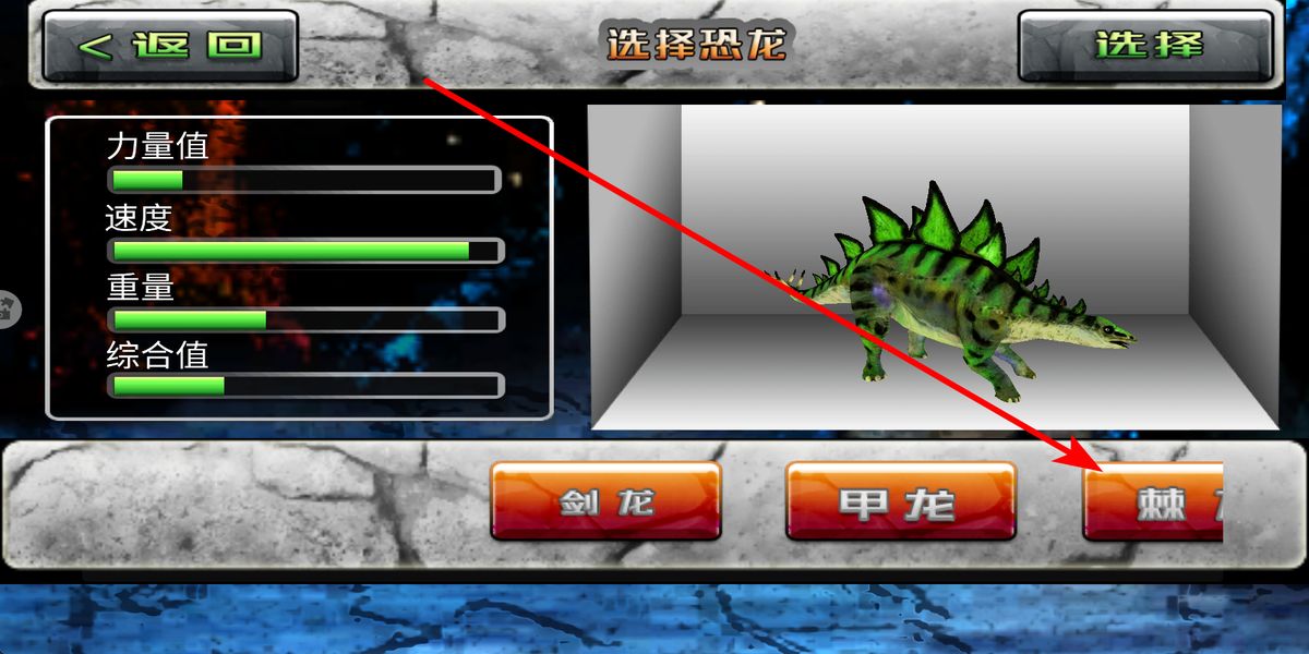 1、進入游戲主界面,點擊開始,跳轉(zhuǎn)恐龍選擇頁,查看劍龍、甲龍、棘龍等屬性力量速度重量綜合值,選心儀恐龍,點選擇確定。