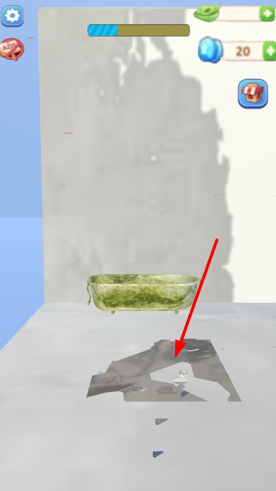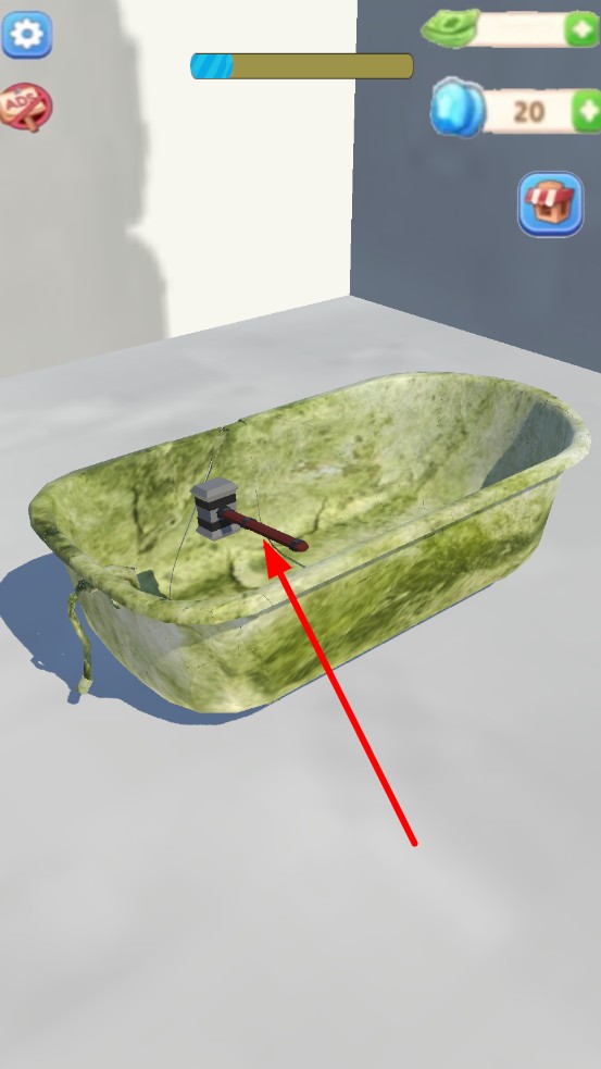 1、選擇待改造生銹浴缸,點(diǎn)擊界錘子,滑動屏幕瞄準(zhǔn)敲擊位置,正式開啟拆解流程。