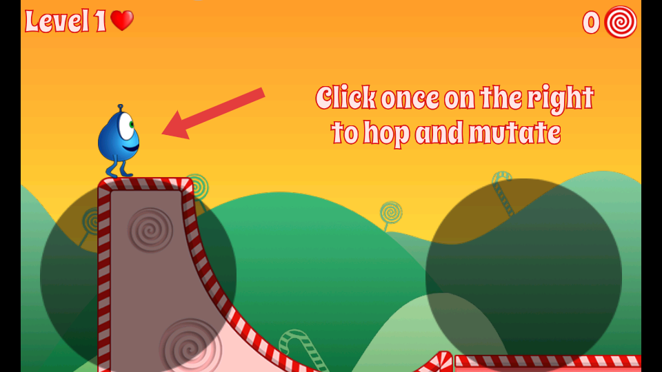 1、第一個(gè)階段,點(diǎn)擊右側(cè)的區(qū)域,讓藍(lán)色的小怪物跳躍并突變,按照提示操作來完成基礎(chǔ)的動(dòng)作。