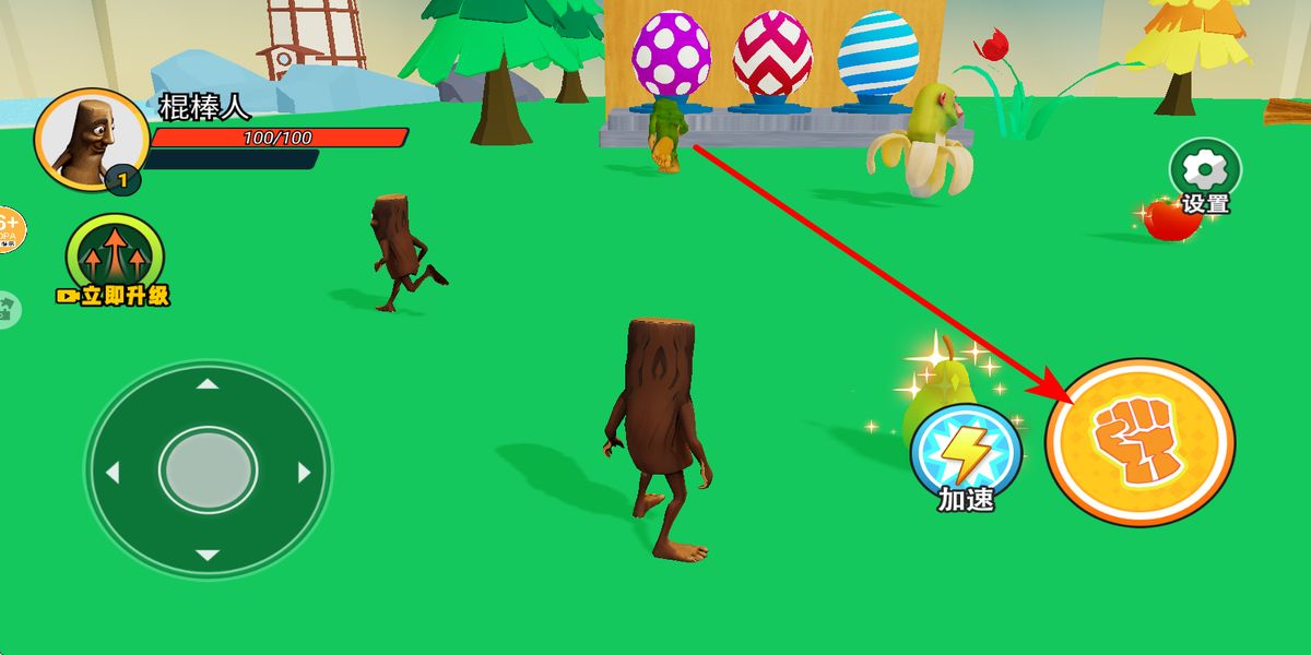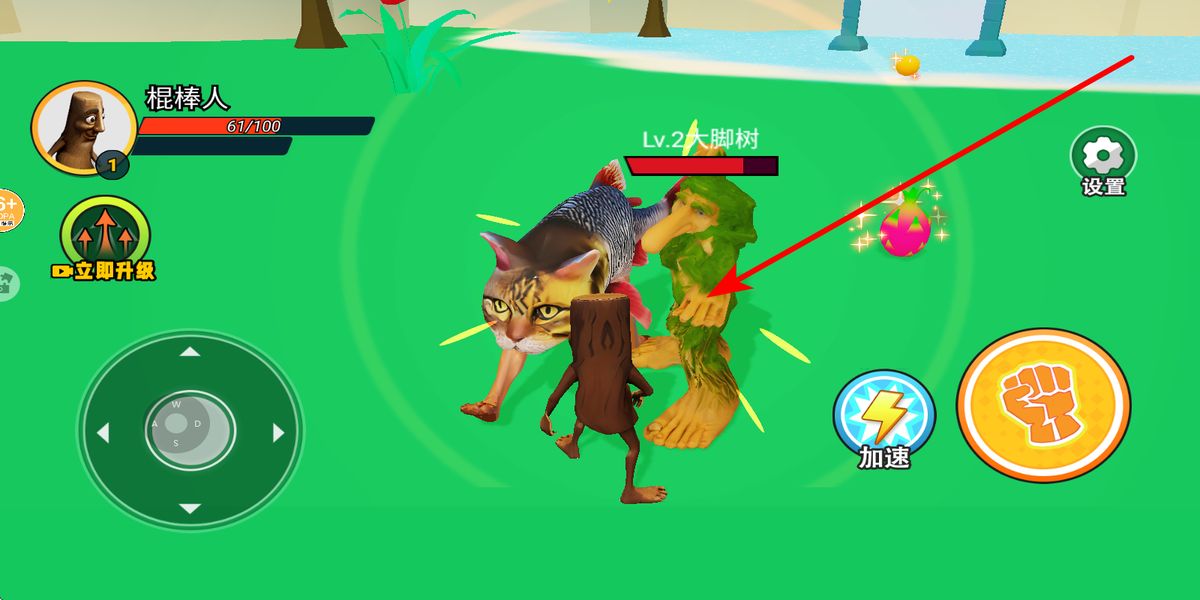 2、遇到異獸如大腳樹等敵人時(shí),點(diǎn)擊右側(cè)拳頭圖標(biāo)釋放普通攻擊,消耗敵人血量,注意觀察敵人動(dòng)作,適時(shí)躲避反擊,保證自身生存。
