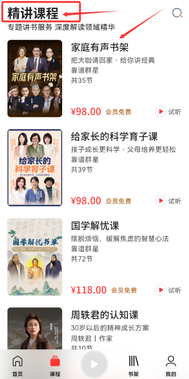 2、進(jìn)入精品課程專區(qū),可發(fā)現(xiàn)育兒課、認(rèn)知課等系統(tǒng)化有聲學(xué)習(xí)資源。