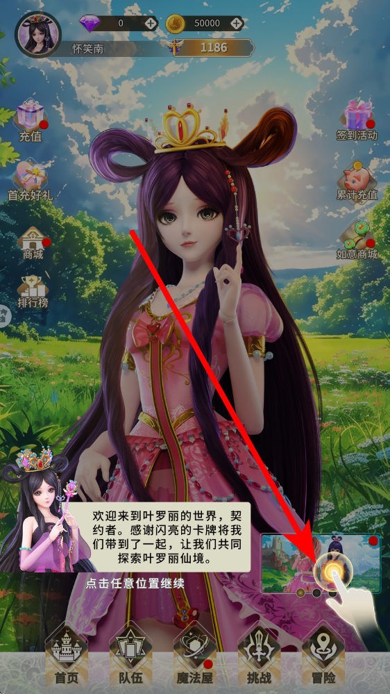 1、進入游戲界面,選新的服務(wù)器或夢幻服,點進入游戲,創(chuàng)建角色后,在歡迎頁按指引點擊任意位置,開啟葉羅麗仙境探索之旅。
