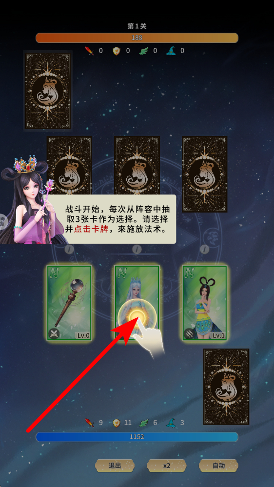 2、主界面的下方有冒險等功能,點冒險進入挑戰(zhàn)關(guān)卡,戰(zhàn)斗前抽取卡牌,依據(jù)提示選卡施法,利用卡牌技能應(yīng)對敵人,推進關(guān)卡。