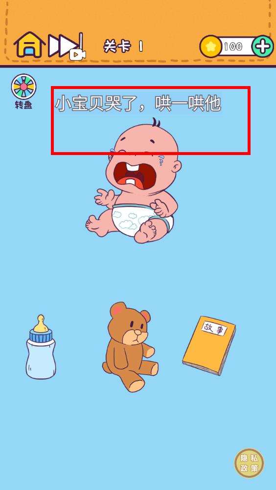 3、遇到小寶貝哭了,哄一哄他關(guān)卡,嘗試點擊奶瓶、玩具熊、故事書等道具,滿足寶寶需求,完成關(guān)卡目標。