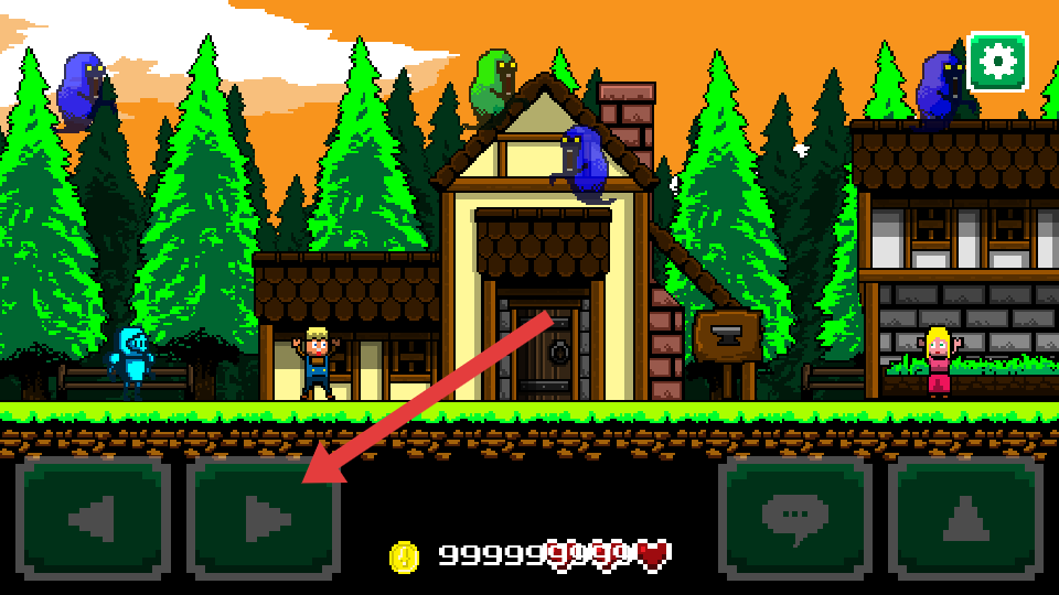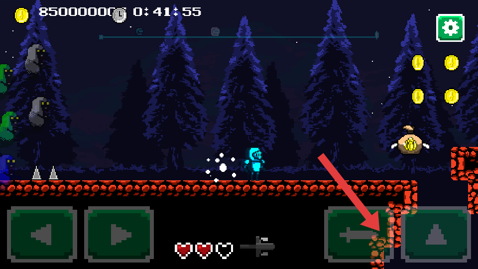3、進(jìn)入森林關(guān)卡,注意避開尖刺陷阱,收集空中金幣和錢袋,利用移動(dòng)按鍵操控角色跳躍、前進(jìn),完成關(guān)卡挑戰(zhàn)。