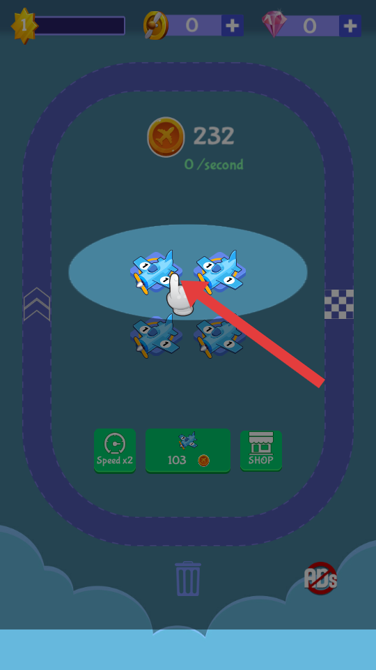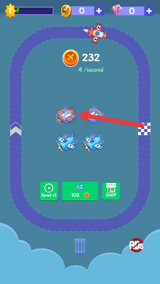 1、進(jìn)入游戲,點(diǎn)擊相同藍(lán)色飛機(jī)進(jìn)行合成,升級(jí)飛機(jī)類型,為軌道運(yùn)行做準(zhǔn)備,提升收益效率。