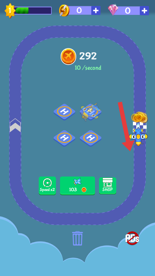 3、持續(xù)合成更高級(jí)飛機(jī),鋪滿軌道上的停機(jī)位標(biāo)識(shí),增加軌道運(yùn)行飛機(jī)數(shù)量,提升每秒的產(chǎn)出。