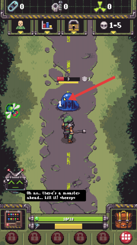2、前行遇藍色怪物,根據(jù)提示前面有一個怪獸,要操控角色靠近進行屏幕點擊攻擊,熟悉戰(zhàn)斗操作。