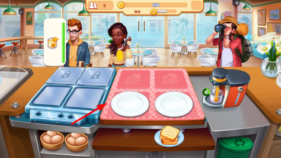 1、進入游戲后,從基礎廚房開始,熟悉各類廚具的使用方法,按照食譜提示準備食材、進行烹飪,為第一位顧客制作簡單美食。
