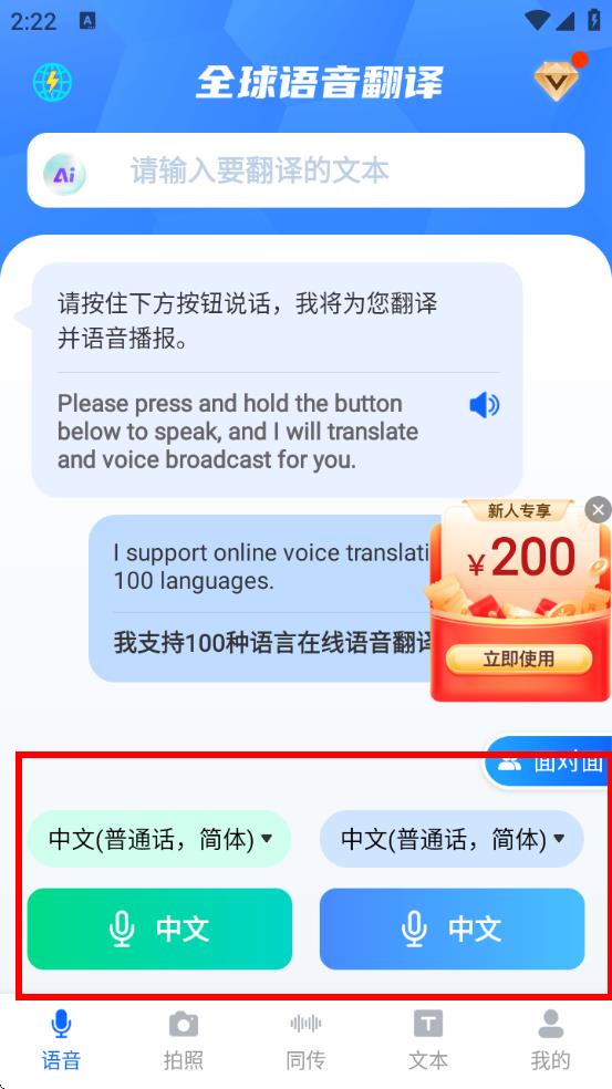 1、進(jìn)入全球語(yǔ)音翻譯界面,輸文本,或按住下方語(yǔ)音按鈕說話,松手后獲取翻譯及語(yǔ)音播報(bào)。