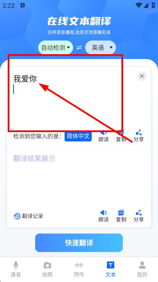 3、輸入文字,選目標(biāo)語(yǔ)言,多種的語(yǔ)言,點(diǎn)擊快速翻譯,得到文本翻譯,還可朗讀、復(fù)制分享。
