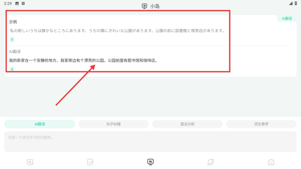 2、進入小島頁面,查看示例中日文對照及翻譯內(nèi)容,借助AI翻譯等功能學習語言知識。