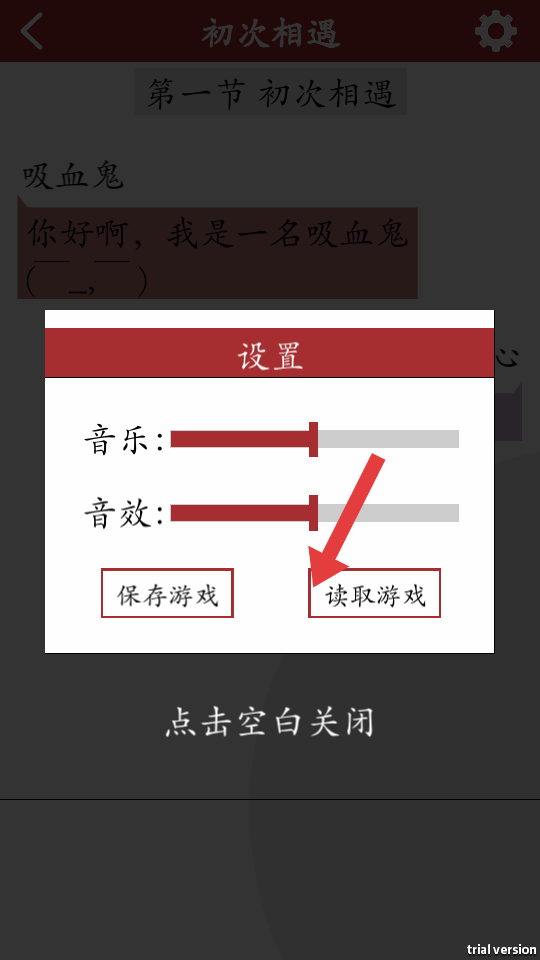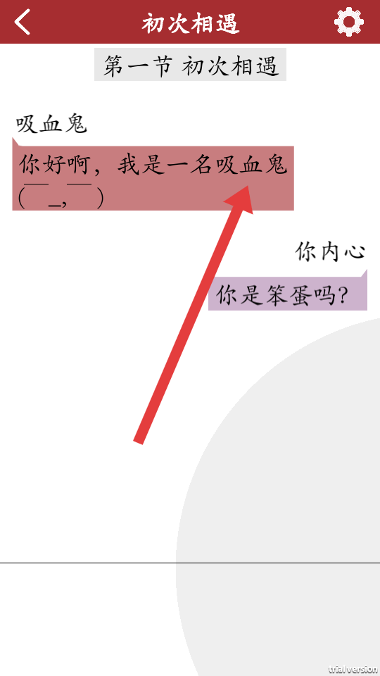 1、點(diǎn)擊開始游戲,進(jìn)入初次相遇章節(jié),閱讀吸血鬼與你的對話,推進(jìn)了劇情,觸發(fā)了互動的選擇。