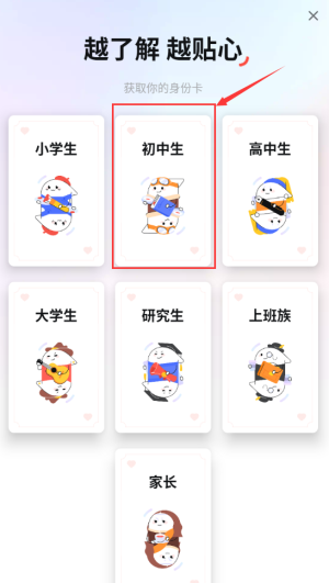 2、選擇紅框初中生卡片,設定用戶身份類型。