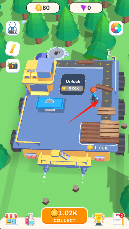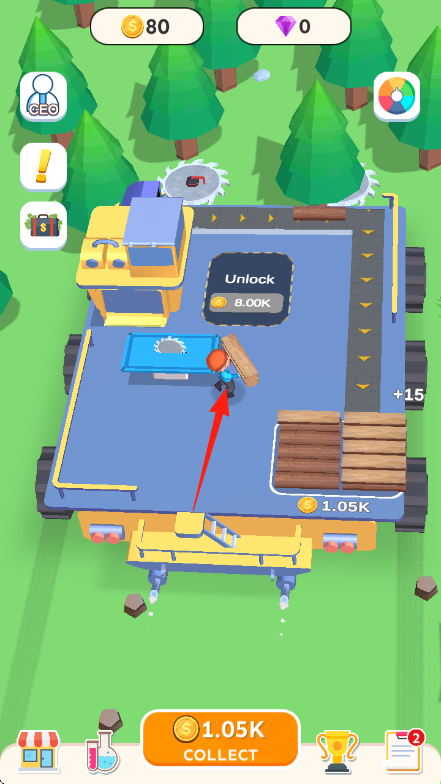 2、讓角色搬運(yùn)木板,放置到藍(lán)色切割區(qū)域,切割木板獲取金錢如【+15】,增加收入。