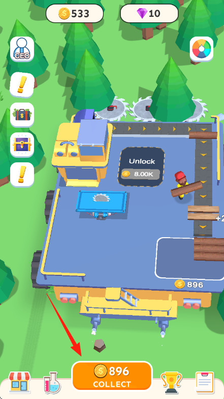 3、積累一定金錢后,點(diǎn)擊屏幕下方的【COLLECT】收集金錢,利用資金解鎖新區(qū)域或升級(jí)設(shè)備,推進(jìn)游戲進(jìn)程。