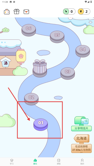 2、進入趣玩頁面,選擇標有01的關卡,點擊進入,開始日語知識闖關挑戰(zhàn),積累學習成果。