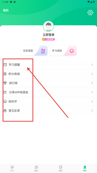3、切換到我的界面,點擊學習提醒等功能,可設置學習提醒、查看積分商城等,管理學習進程。