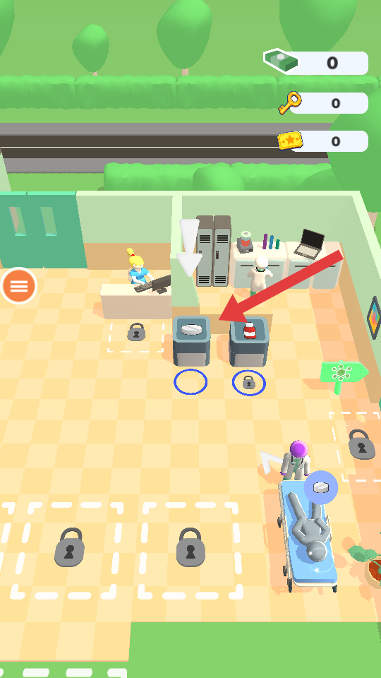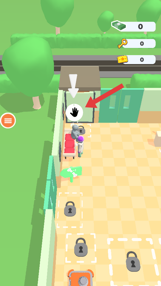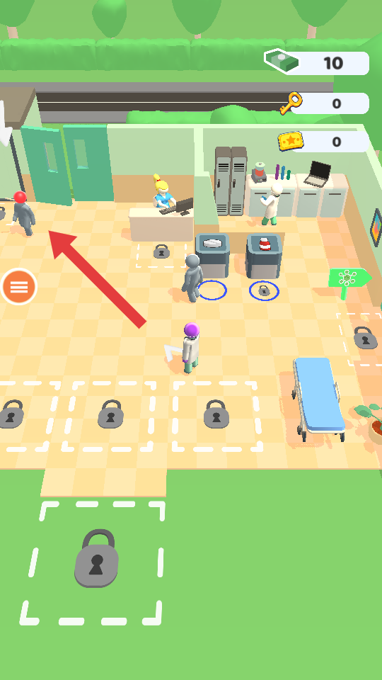 3、緊跟箭頭指引靈活操控角色避開(kāi)無(wú)關(guān)區(qū)域,利用點(diǎn)擊互動(dòng)解鎖場(chǎng)景如診室里的鎖柜,收集鈔票。