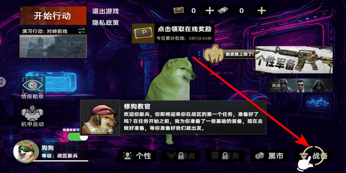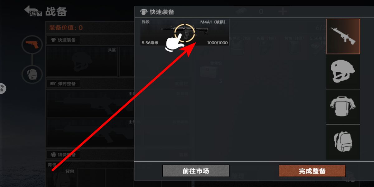 1、進入主界面點擊戰(zhàn)備,在快速裝備欄選定武器M4A1,查看彈藥容量等信息,確認后點擊完成整備,為戰(zhàn)場對抗儲備核心火力。