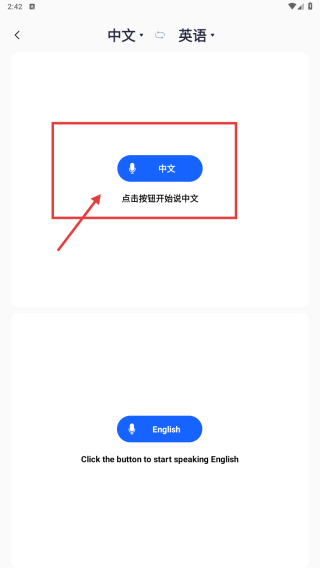 2、進(jìn)入語音翻譯頁面,點擊中文按鈕,開始說中文,應(yīng)用將實時轉(zhuǎn)換為英語翻譯結(jié)果。