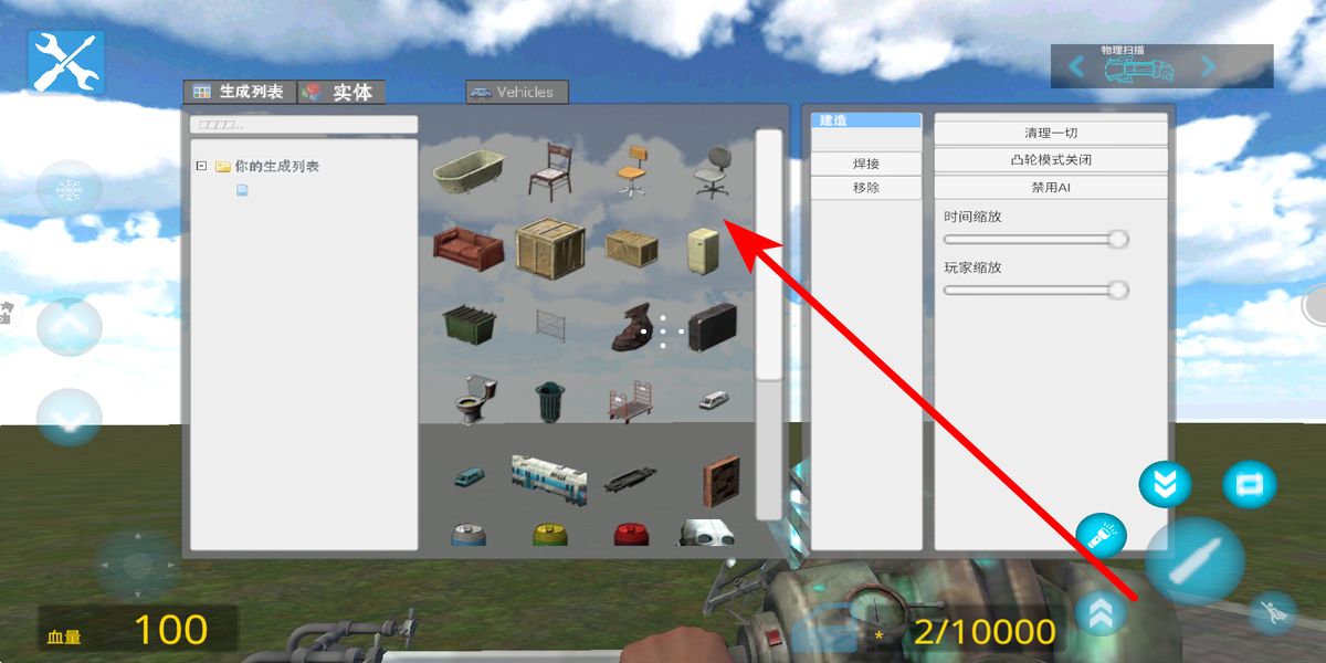 1、進(jìn)入主界面點(diǎn)擊開始新游戲,加載后進(jìn)入沙盒場(chǎng)景,熟悉右側(cè)生成、建造等按鍵,查看血量數(shù)值,為物品生成與場(chǎng)景搭建做準(zhǔn)備。