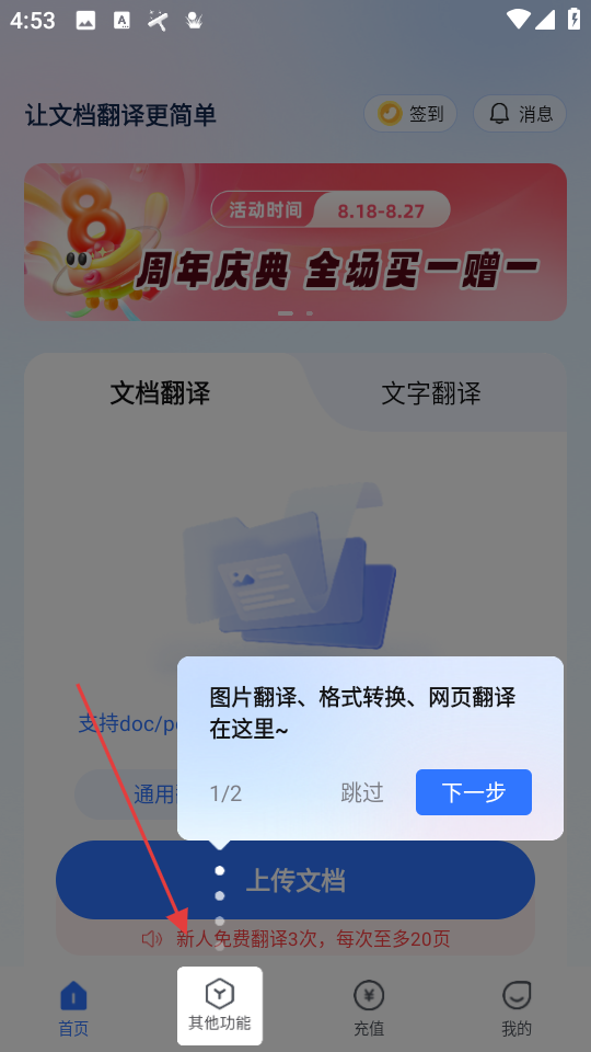 1、首頁點其他功能,彈窗引導了解圖片翻譯等功能,可跳過或按步驟操作。