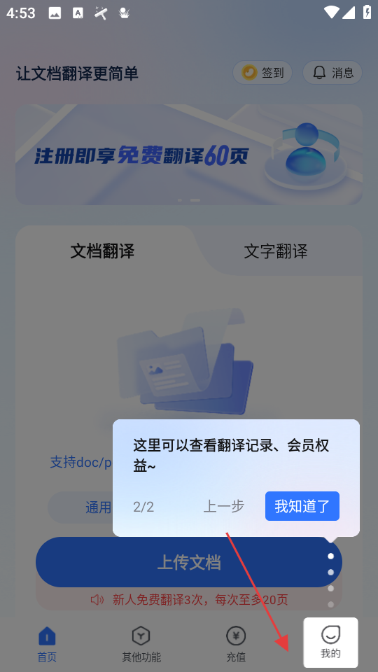 2、首頁點我的,彈窗提示可查翻譯記錄,會員權益,點我知道了關閉引導。