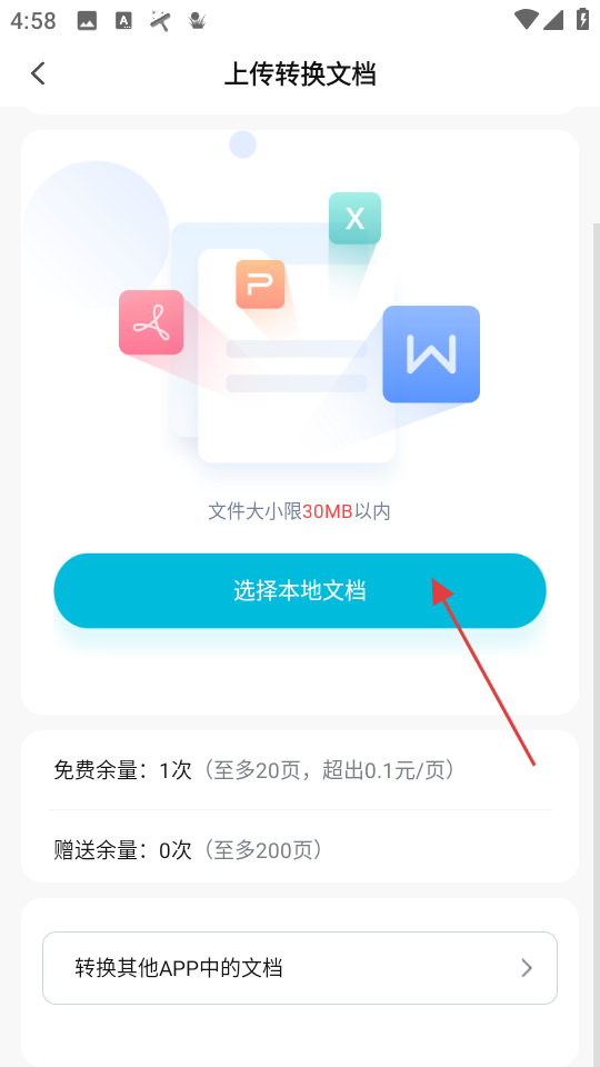 3、進入上傳轉換文檔頁,點選擇本地文檔,按限制上傳文件,查看免費及贈送余量。