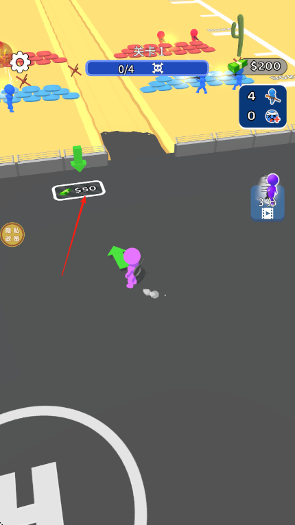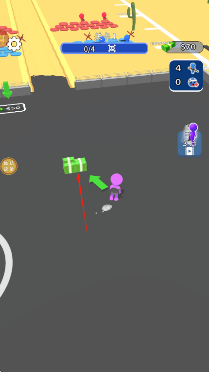 2、繼續(xù)移動(dòng)紫色小人,收集地面上的金錢(qián)標(biāo)識(shí)道具如$50,增加游戲內(nèi)金錢(qián)數(shù)量$70變?yōu)?200。