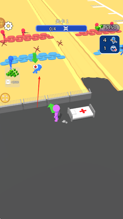 3、留意場(chǎng)景中受傷的藍(lán)色小人,按紅箭頭指引,讓紫色小人靠近并救援,成功救援會(huì)有相應(yīng)提示,完成4次收集和救援任務(wù)即可過(guò)關(guān)。