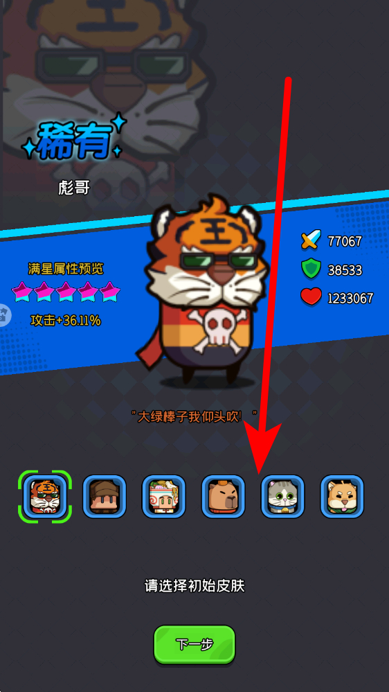 1、選初始皮膚界面陳列彪哥等多款角色皮膚,可查看滿星屬性預覽等信息,選定心儀皮膚后點擊下一步,定制角色初始外觀與基礎屬性。