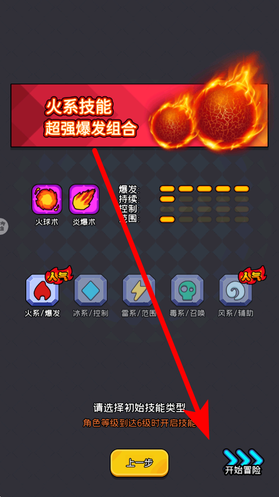 2、選技能類型界面展示火系爆發(fā)、冰系控制等技能分支,選定類型后角色達6級解鎖對應技能,決定后續(xù)戰(zhàn)斗風格與輸出策略側重。