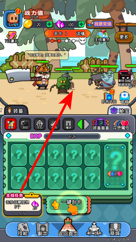 3、初戰(zhàn)怪物進入關卡1,跟隨主線任務擊殺任意怪物,界面支持一鍵刮卡功能,完成首戰(zhàn)積累經(jīng)驗,推進冒險進程開啟新挑戰(zhàn)階段。