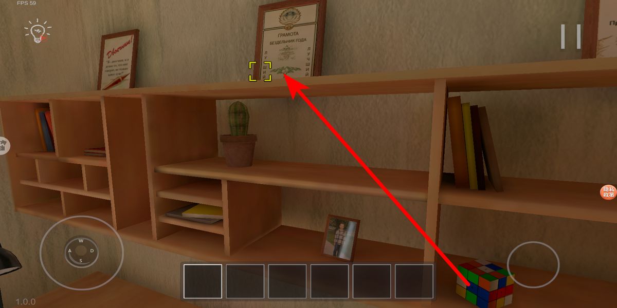 3、書架細節(jié)排查聚焦書架區(qū)域,檢查上層證書的互動效果,查看中層盆栽周邊,點擊下層書籍、魔方及相框,從中發(fā)現隱藏線索,助力破解逃生謎題。