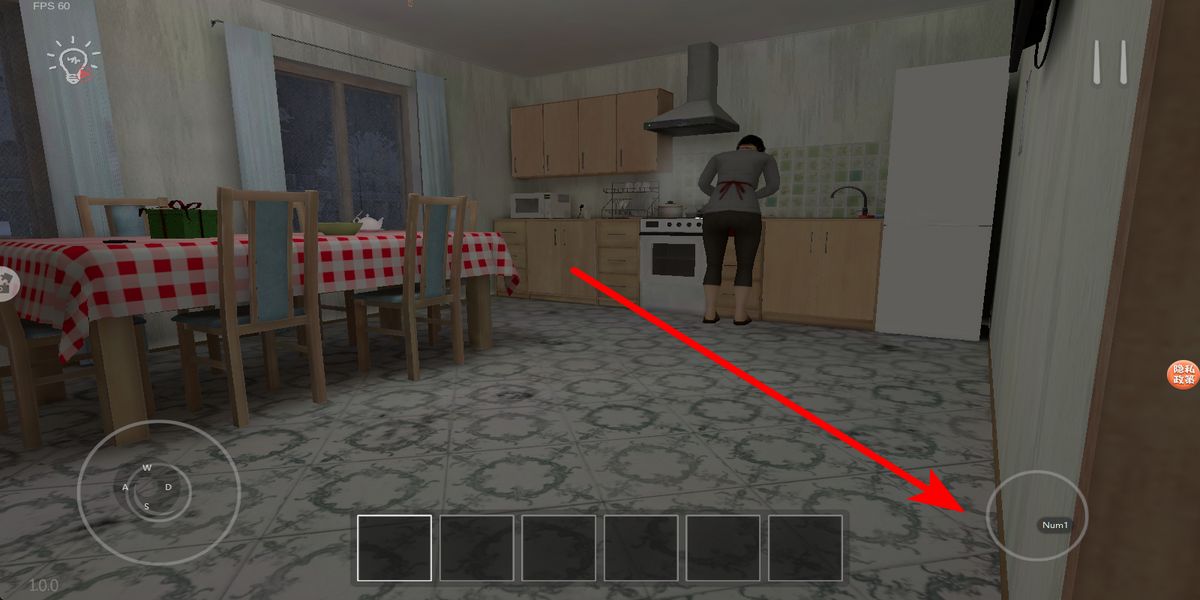 2、廚房潛行躲避進(jìn)入廚房場(chǎng)景時(shí),密切觀(guān)察家長(zhǎng)位置,躲在桌椅等家具后方,待其專(zhuān)注做事時(shí),緩慢悄悄移動(dòng),避免觸發(fā)視線(xiàn)警報(bào),逐步積累逃家機(jī)會(huì)。