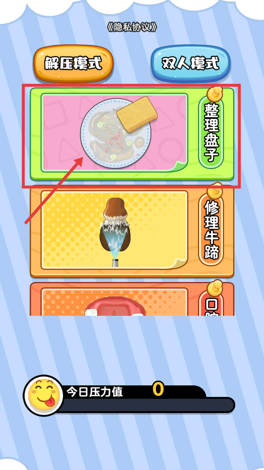 1、進入【解壓模式】,選擇【整理盤子】任務,開啟餐具清潔的解壓玩法,熟悉操作邏輯。