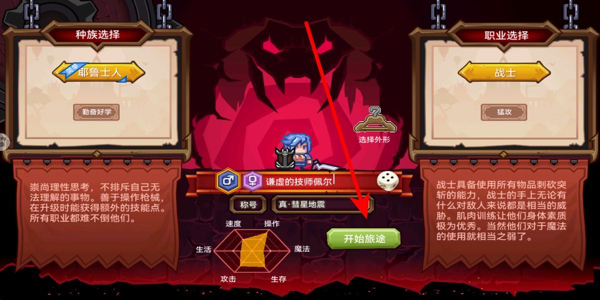 1、種族職業(yè)設(shè)定創(chuàng)建角色時(shí),左側(cè)選擇種族耶魯士人,右側(cè)選定職業(yè)戰(zhàn)士,擅長物理攻擊,確定外形與稱號后,點(diǎn)擊開始旅途,奠定角色發(fā)展方向。