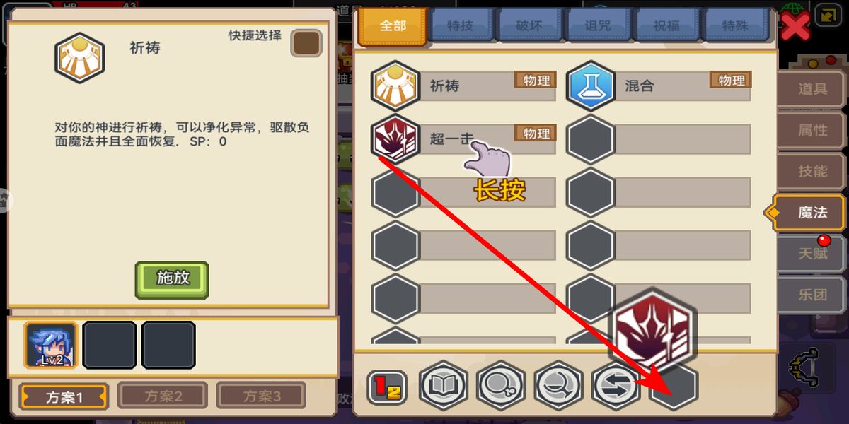 3、技能配置技巧打開魔法界面,長按技能超一擊拖動(dòng)至快捷欄,戰(zhàn)斗時(shí)點(diǎn)擊施放,祈禱可凈化異常狀態(tài),按需配置技能方案,提升戰(zhàn)斗應(yīng)對靈活性。
