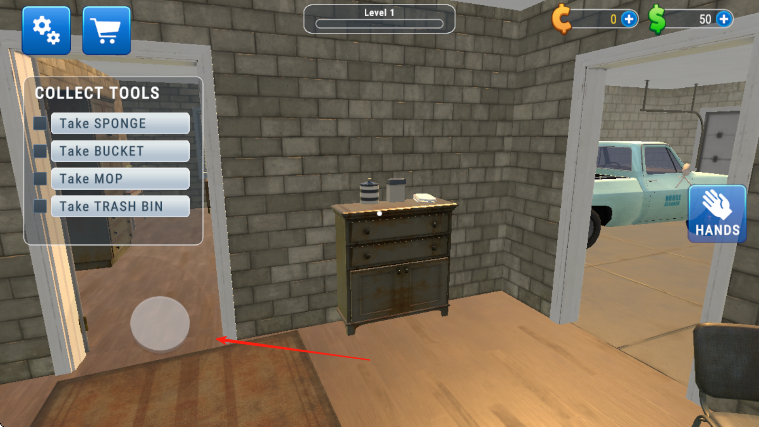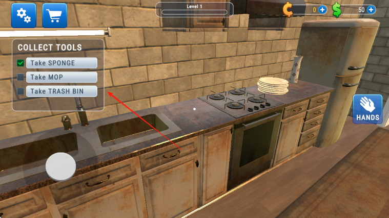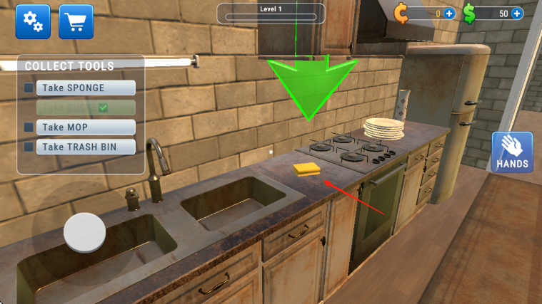 1、開局看左側(cè)工具列表,快速找齊海綿、水桶等,完成收集,為清潔備齊武器。