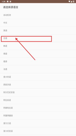 2、在源語(yǔ)言選擇頁(yè)面,選擇目標(biāo)源語(yǔ)言如日語(yǔ),返回翻譯主頁(yè)面。