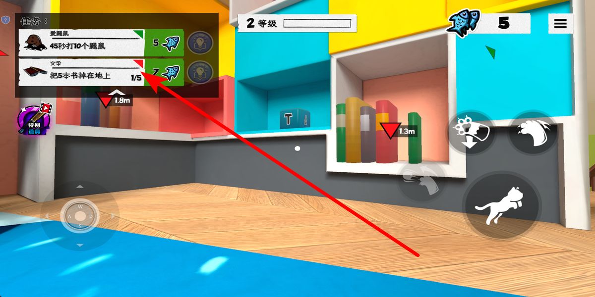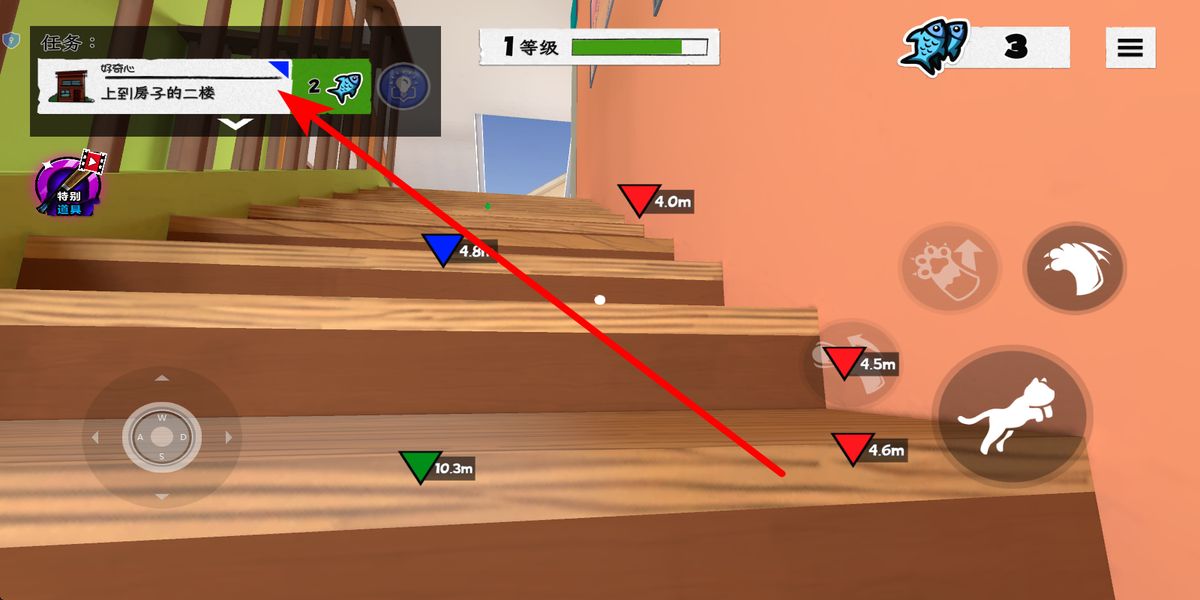 1、接收任務(wù)在界面左上角查看任務(wù)欄,明確任務(wù)目標(biāo),上到房子的二樓,依據(jù)紅色箭頭指引方向,操控貓咪前往對(duì)應(yīng)區(qū)域,推進(jìn)任務(wù)進(jìn)程。