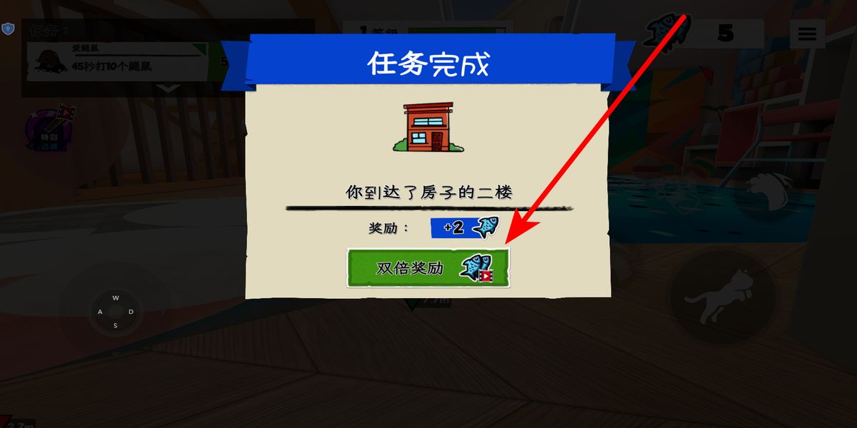 2、完成領(lǐng)獎(jiǎng)達(dá)成任務(wù)條件抵達(dá)二樓后,彈出任務(wù)完成界面,可選擇直接領(lǐng)取基礎(chǔ)獎(jiǎng)勵(lì),或點(diǎn)擊雙倍獎(jiǎng)勵(lì)按鈕需觀看廣告獲取更多獎(jiǎng)勵(lì),積累資源。