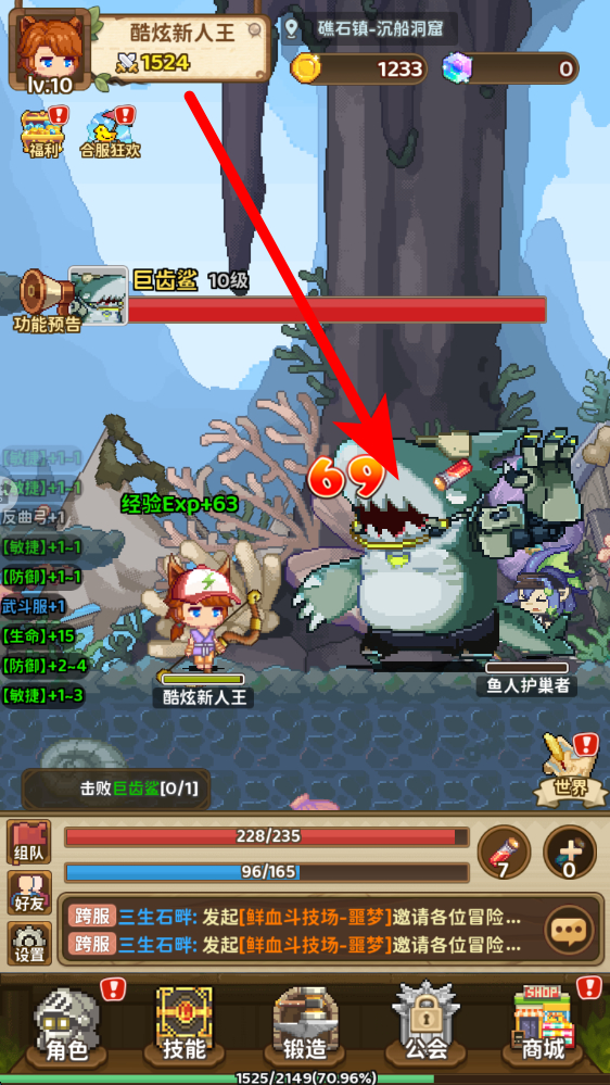 2、進(jìn)入沉船洞窟的場景,挑戰(zhàn)首領(lǐng)怪物巨齒鯊,合理釋放角色技能,把控戰(zhàn)斗時(shí)節(jié)奏,成功擊敗后解鎖新內(nèi)容,提升角色的實(shí)力。