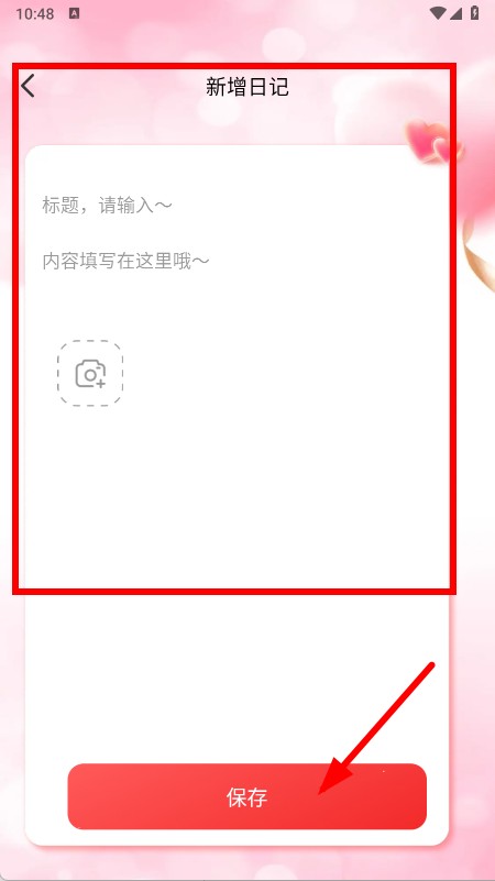 3、填寫(xiě)日記標(biāo)題、內(nèi)容,可添加圖片,點(diǎn)擊保存,完成記錄。