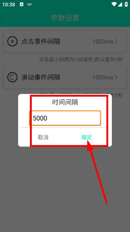 3、在時(shí)間間隔設(shè)置框中,輸入時(shí)間值后,點(diǎn)擊確定完成點(diǎn)擊事件間隔設(shè)置。