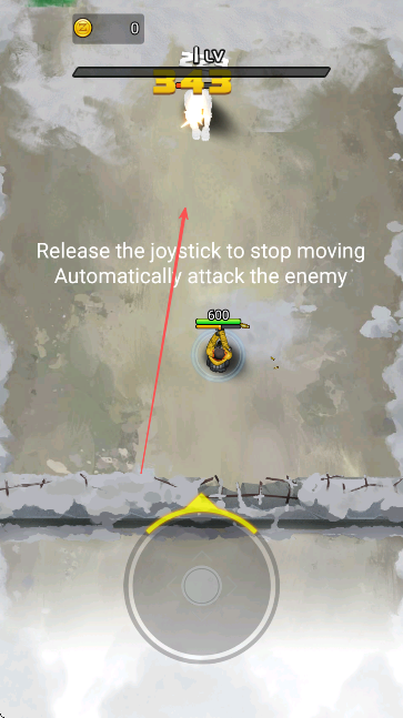 1、操控下方搖桿移動(dòng)角色、松開搖桿可自動(dòng)攻擊敵人、按提示行動(dòng)靠近并攻擊上方敵人即可。