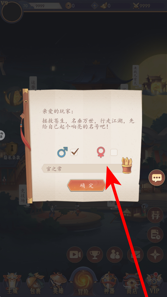1、新人剛進入游戲,首先需要選擇性別,在輸入框起響亮名號,點擊確定完成角色創(chuàng)建,開啟冒險之旅,為后續(xù)行動奠定基礎。