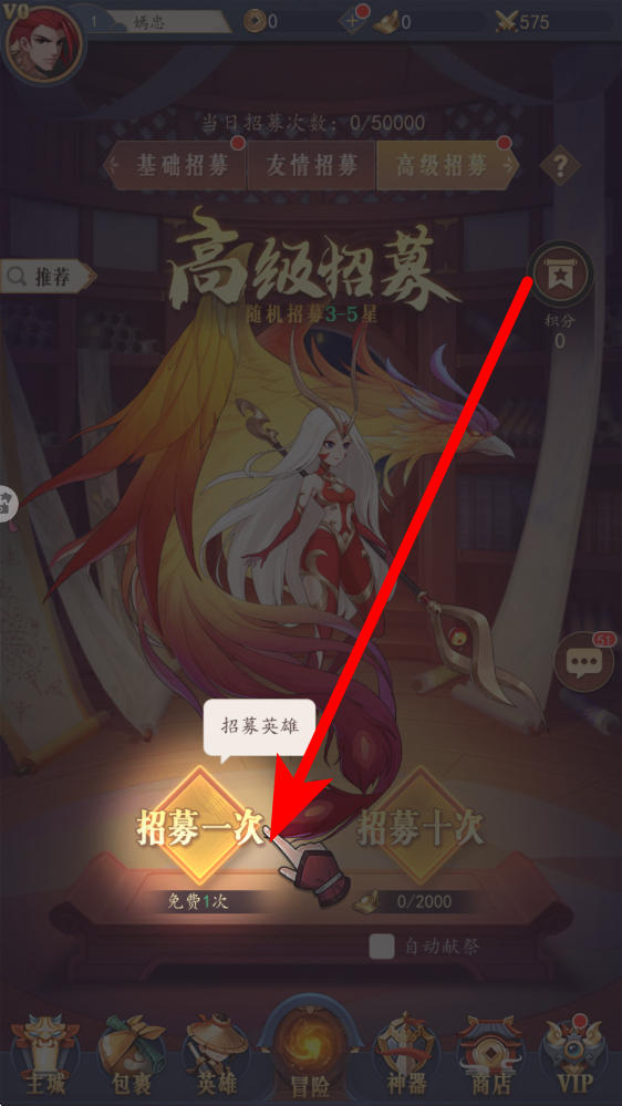 2、然后前往高級招募界面,點擊招募一次有免費次數(shù)時優(yōu)先使用,獲取初始英雄角色,借助招募擴充隊伍,提升隊伍戰(zhàn)力儲備。